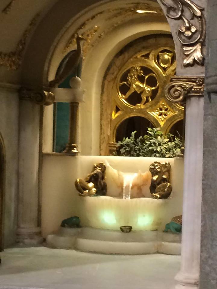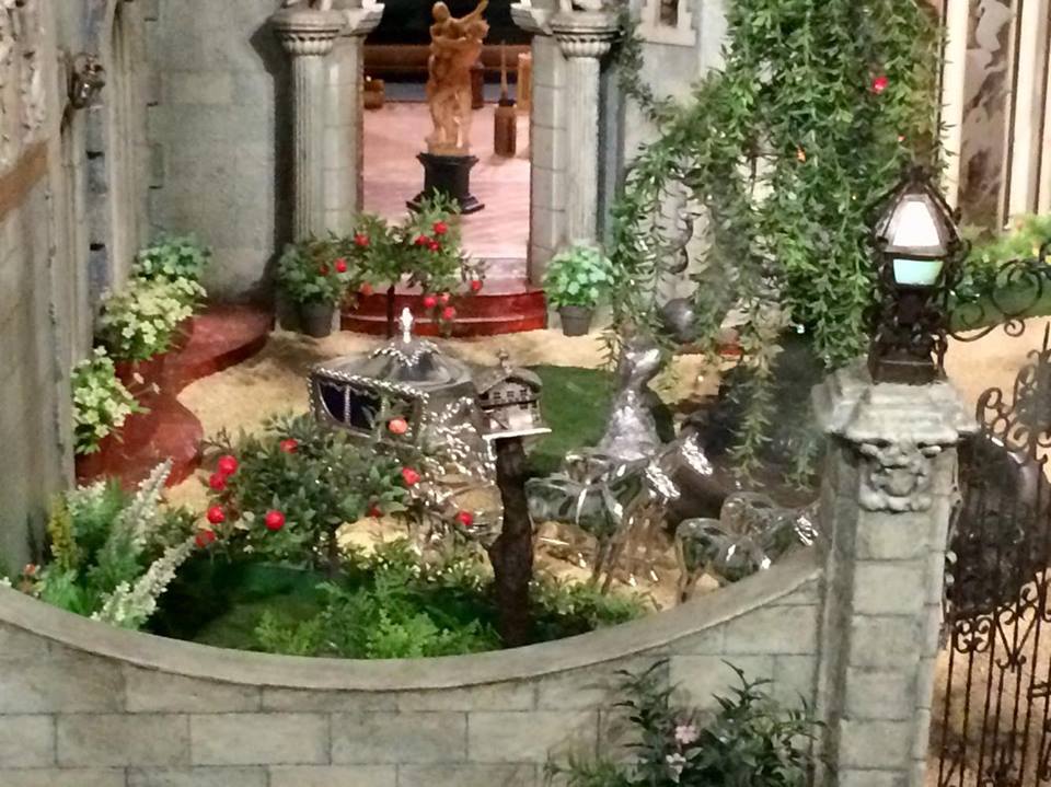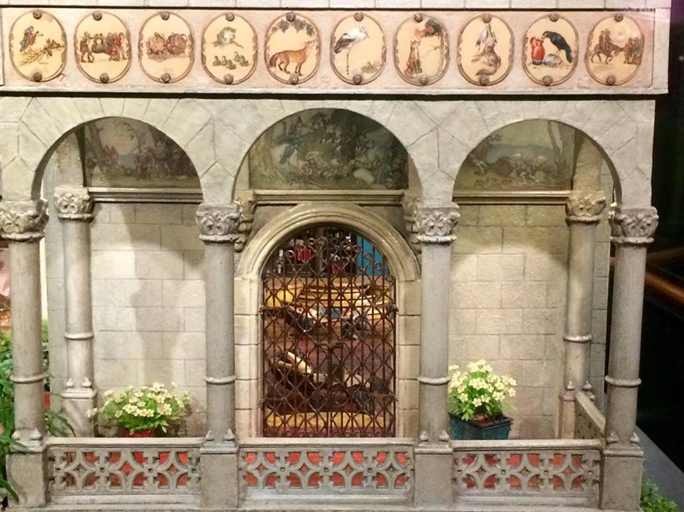 The Magic Garden features the rocking cradle of Rock-a-bye Baby, which is in perpetual motion. The golden cradle is bedecked with pearls made from the jewelry of Moore’s grandmother, who believed that more people would visit the dollhouse than her grave. There is also a replica of Napoleon’s carriage in the garden, which was gifted to Moore by automobile designers from Detroit. When the dollhouse first debuted, Franklin D. Roosevelt’s mother presented Moore with a gold plaque for the castle, which is still affixed to the dollhouse. The outside of the dollhouse is decorated with reliefs from stories such as The Wizard of Oz and Aesop’s Fables.