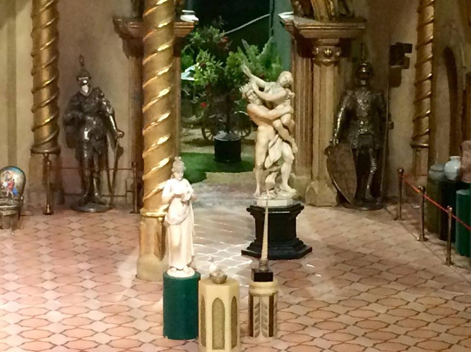 The Great Hall continues the fairytale theme of the dollhouse, featuring paintings of various fairytale and folktale characters. The Great Hall displays items from fairytales like a museum of sorts. Moore commissioned a retired glassblower to fashion Cinderella’s tiny glass slippers for the dollhouse. The Three Bears’ chairs are also showcased in the dollhouse under a glass bell to prevent them from being inhaled. All paintings in the Great Hall are miniature versions of actual works of art. Additional art decorating the Great Hall includes 2000-year-old Egyptian statues, a Roman bronze bust from the first century, and many more treasures given to Moore. Two silver and gold knights from Rudolph Valentino guard the entrance to the Great Hall.