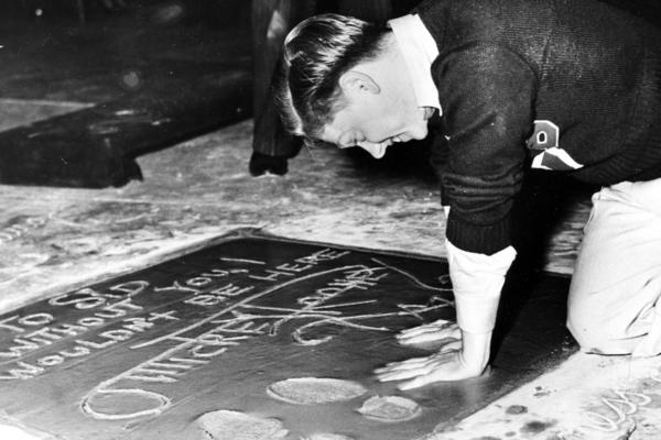 Rooney plants his hands into the cement next to his footprint and signature in the forecourt of Grauman’s Chinese Theatre during induction ceremonies in Hollywood in 1938.