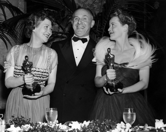 23rd February 1939: American film studio head Jack Warner (1892-1978) poses with his arms around American actors Fay Bainter (1892-1968) and Bette Davis (1908-1989), who hold their Oscars for director William Wyler’s film, ‘Jezebel,’ at the Academy Awards, Los Angeles, California. Davis won Best Actress, and Bainter Best Supporting Actress. Davis wears an evening gown with feathers adorning her shoulders. (Photo by Hulton Archive/Getty Images)