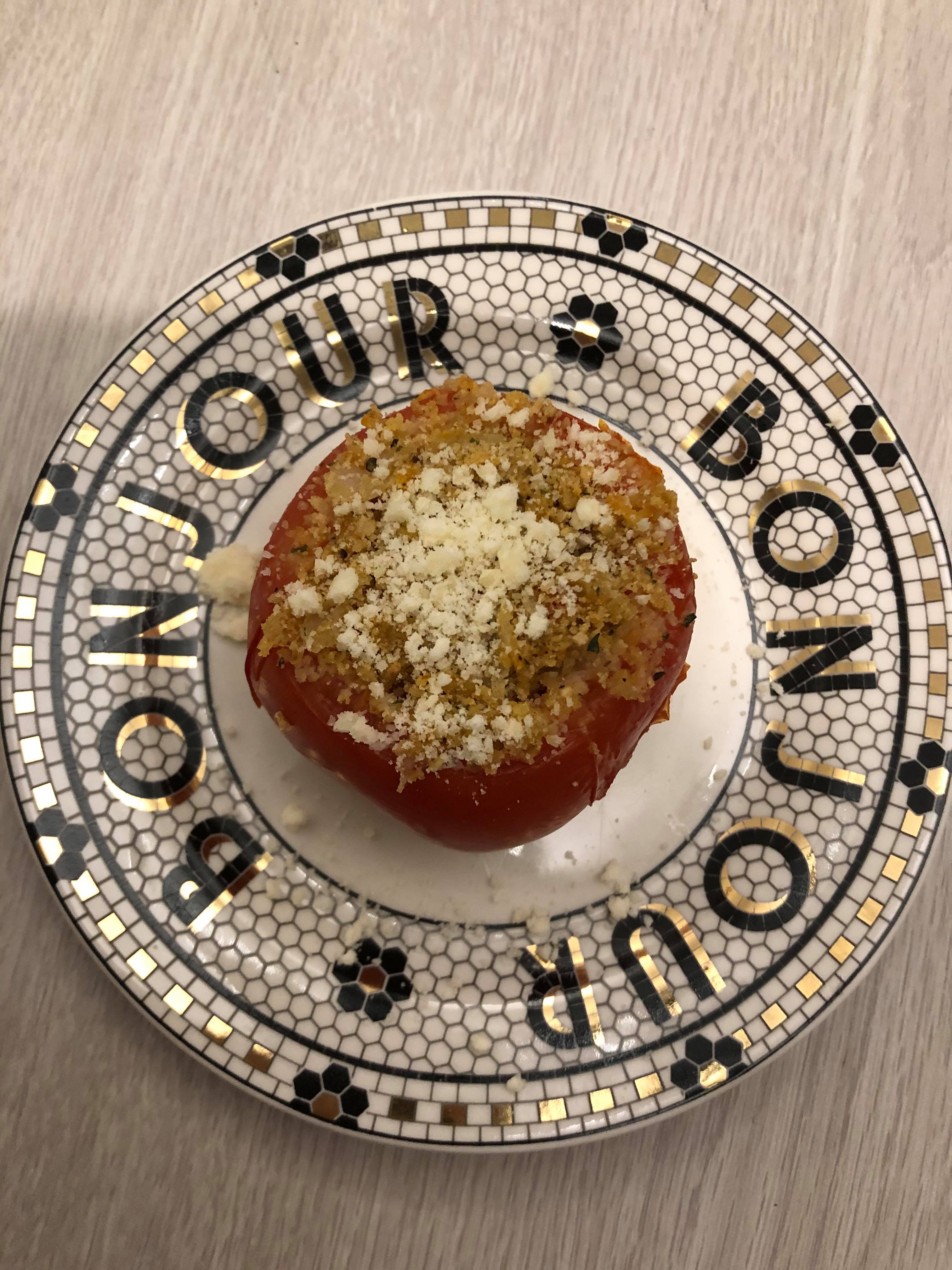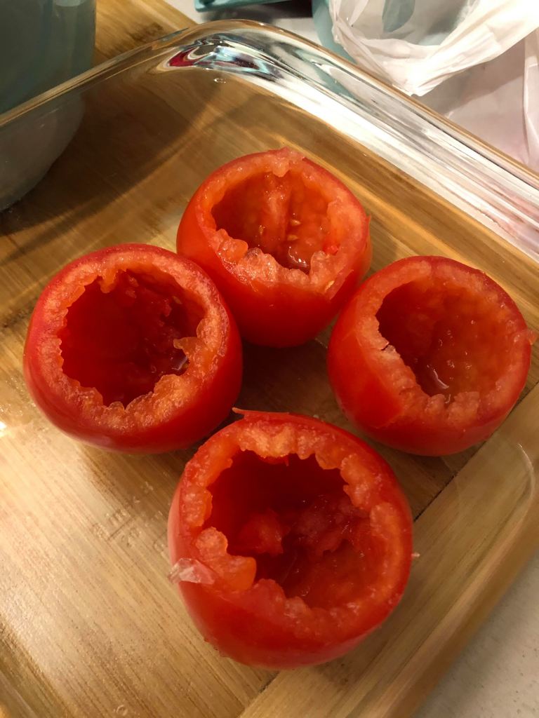 Overall, the recipe is very easy to follow and quite delicious! It involves hollowing out the tomatoes, making a quick filling, and baking the filled tomatoes.