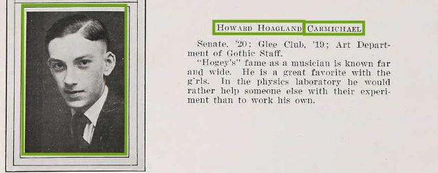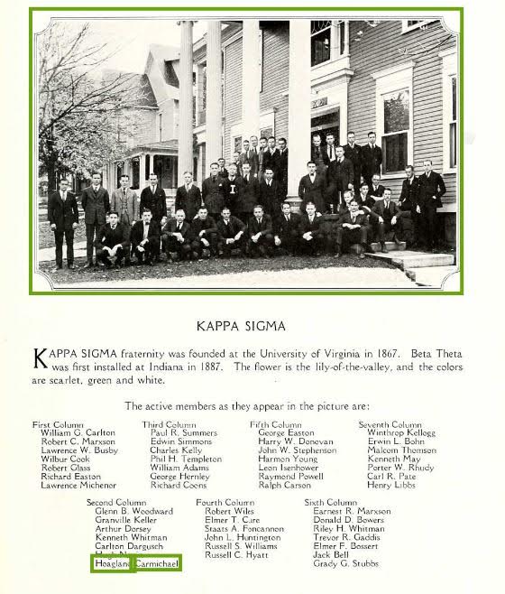 Carmichael continued his educational career at Indiana University in Bloomington, graduating with a Bachelor’s degree in 1925 and a law degree one year later. He was active in the Kappa Sigma fraternity and toured with his band, “Carmichael’s Collegians,” throughout Indiana and Ohio. Following his graduation, Carmichael relocated to Florida and worked as a legal clerk at a legal firm in West Palm Beach, Florida. He returned to Indiana in 1927 after failing to pass the Florida bar exam. Instead, he joined the Bingham, Mendenhall, and Bingham law firm in Indianapolis, passing the Indiana bar exam, but ultimately focused more on his music. No longer interested in law, he moved to New York City. There, he worked for a brokerage firm during the weekdays and spent his evenings composing.