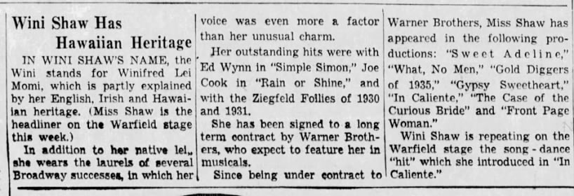 Wini Shaw was born Winifred Lei Momi on February 25, 1907, in San Francisco, California, to James Edmonds Shaw and Esther Pua Kinamu Stephenson. She was of Hawaiian and Irish descent and the youngest of thirteen children.