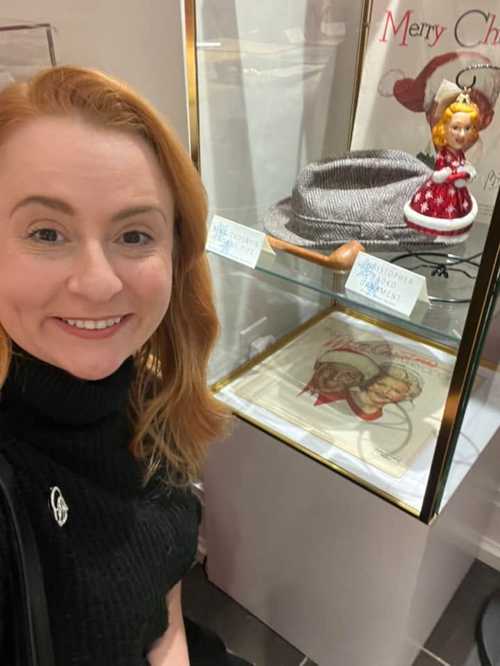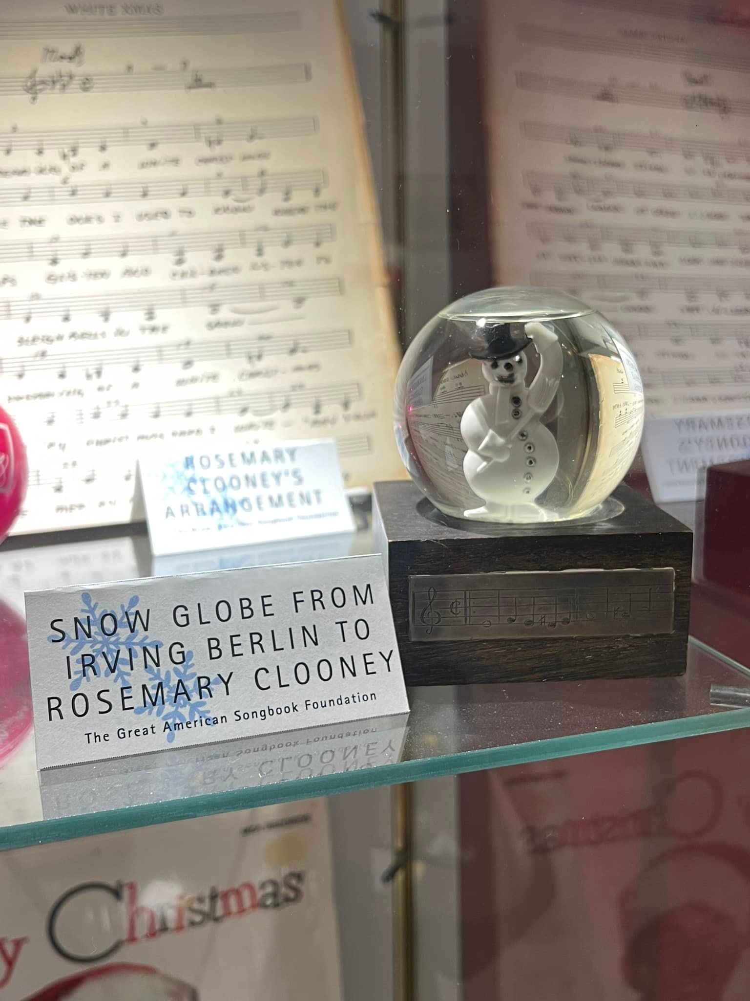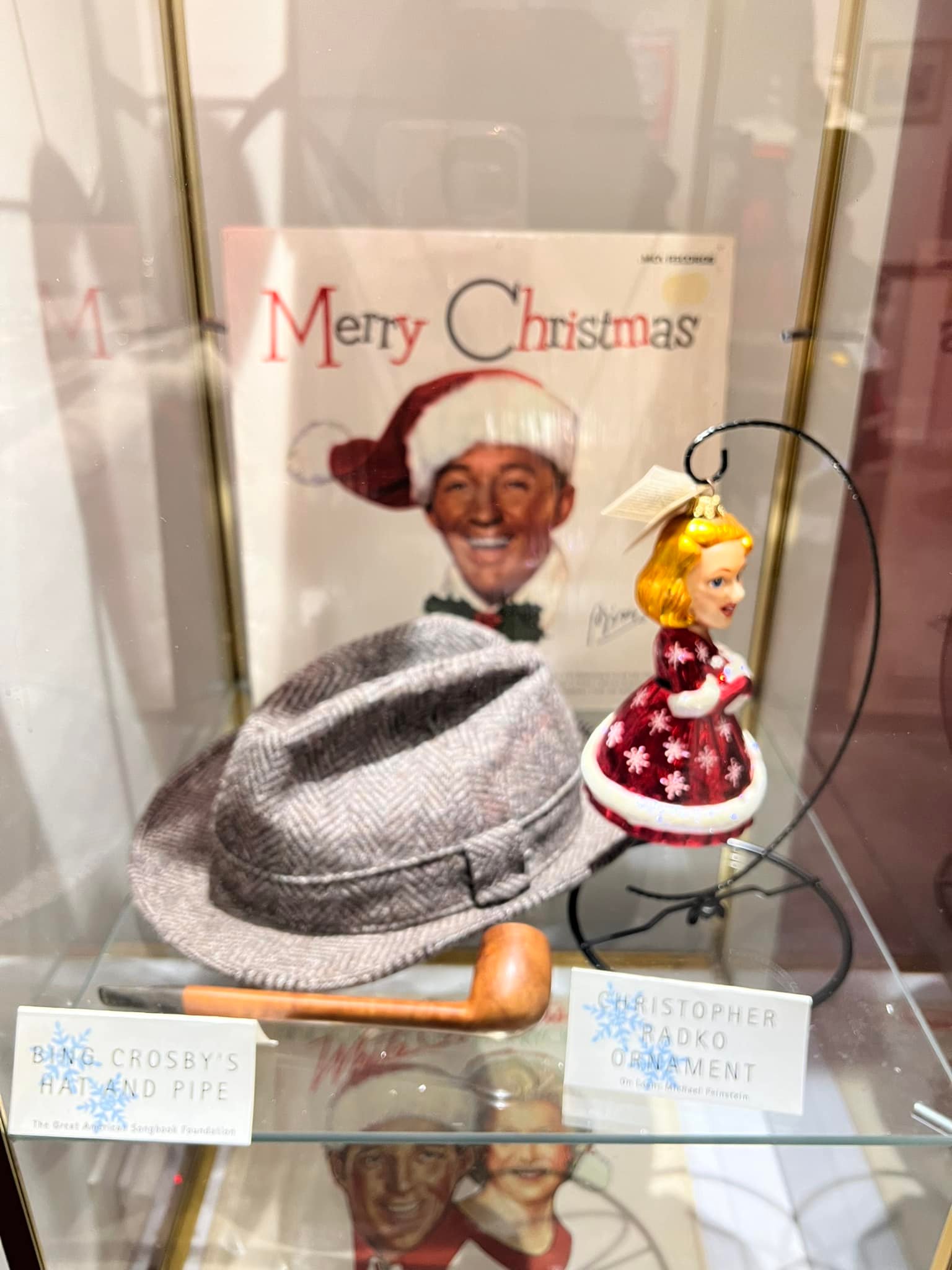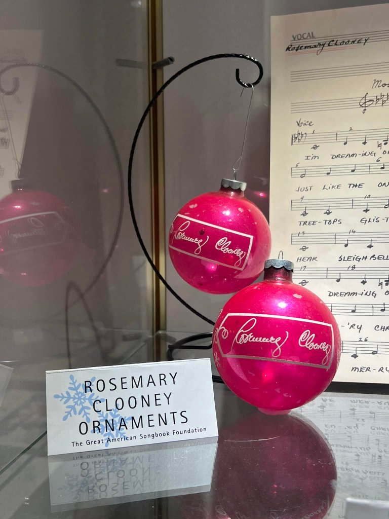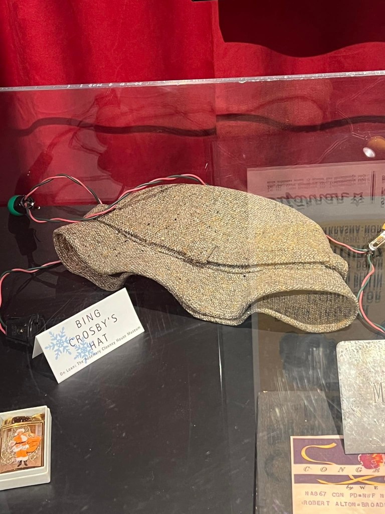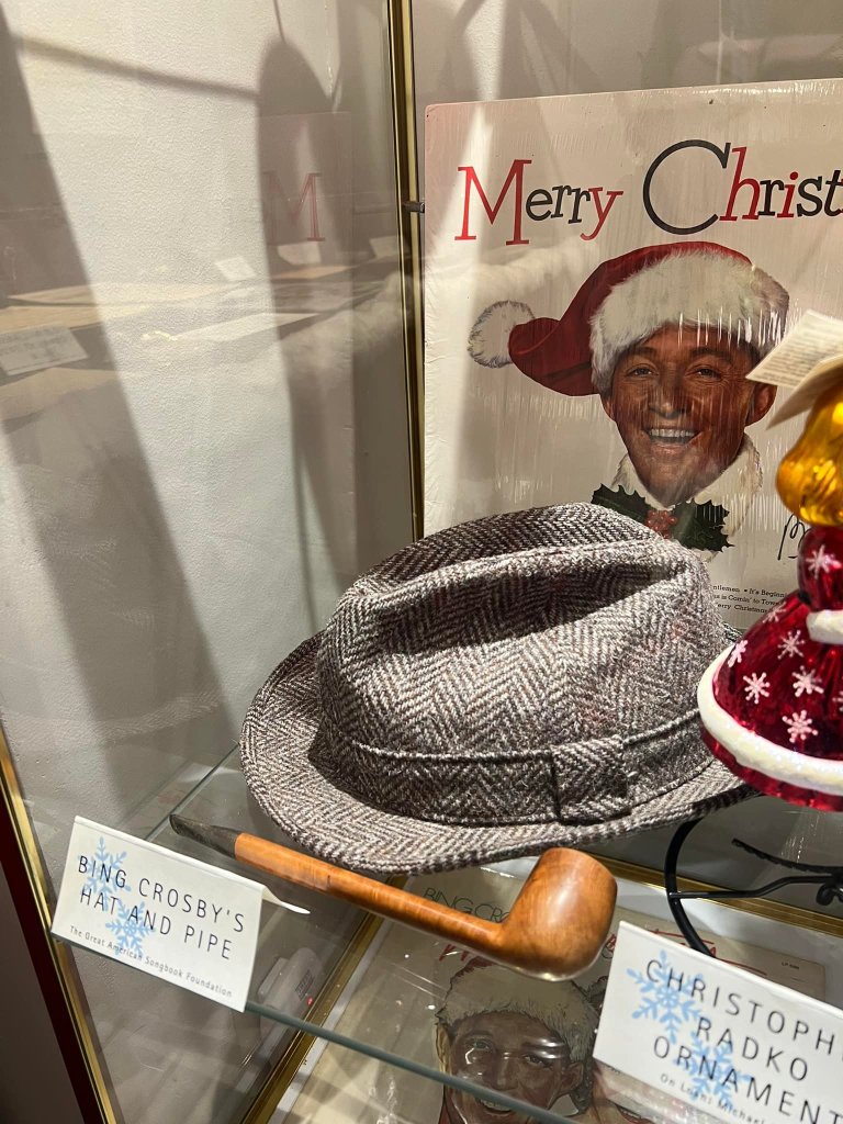 In addition, it was delightful to see Bing Crosby‘s hat and pipe on display, as well as Rosemary Clooney’s ornaments and a snow globe gifted to her by Irving Berlin. If you look closely, you can see the opening melody to “White Christmas” etched onto the front.