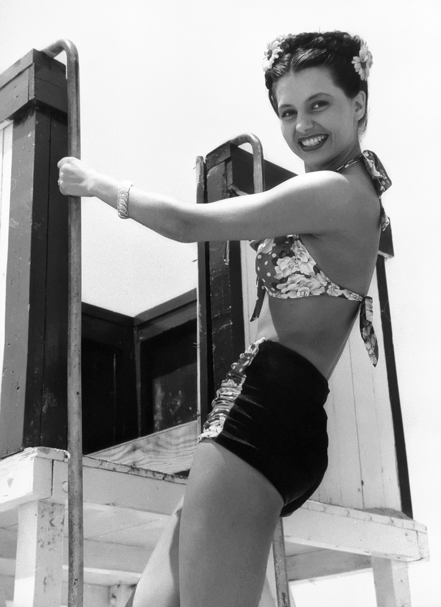 Ballet dancer Cyd Charisse who also aspires to being a movie star, posing on ladder of life guard stand at Santa Monica beach.1945
