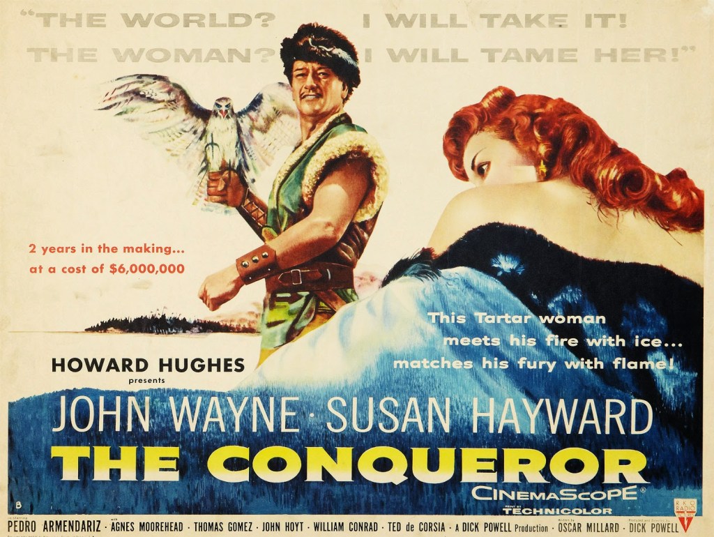 The Conqueror (1956) is the source of much Hollywood lore. This ill-fated production happened to be filmed downwind from an above-ground nuclear testing site. More than half of the crew contracted cancer, with a majority of them dying from the illness.