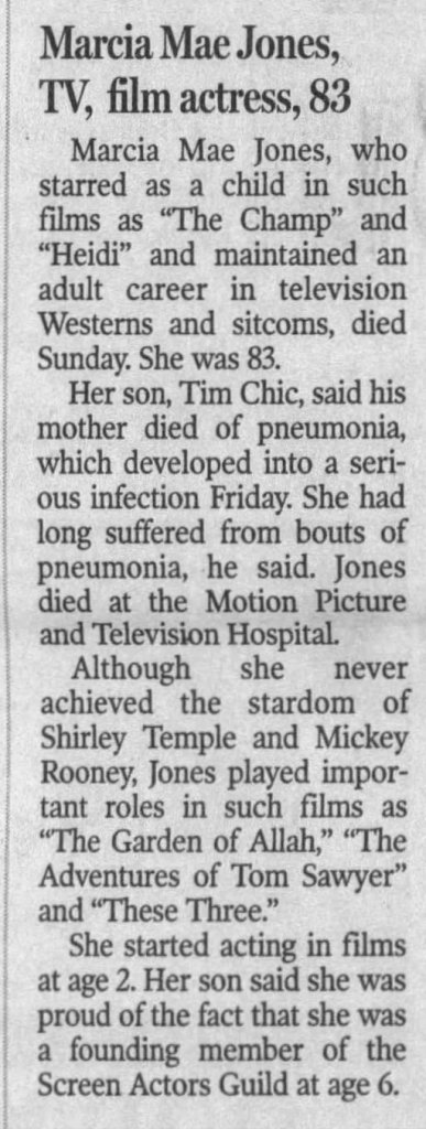 “I don’t know if I could have done as well as my mother did, had the tables been reversed. But she did love me way too much and it did cause trouble and jealousy with my brothers and sister. I can understand today how they must have felt. It was always, ‘Marcia Mae has to go to work. Marcia Mae’s making the money.'” –Marcia Mae Jones