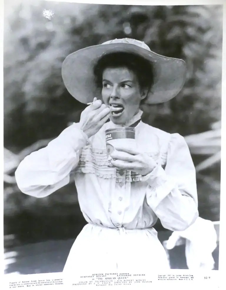 Sources claimed that everyone in the cast and crew got sick except Bogart and Huston, who said they avoided illness by essentially living on imported Scotch whiskey. Bogart later said, “All I ate was baked beans, canned asparagus and Scotch whiskey. Whenever a fly bit Huston or me, it dropped dead.” Lauren Bacall famously ventured along for the filming in Africa to be with husband Bogart. She played den mother during the trip, making camp and cooking. This also marked the beginning of her life-long friendship with Hepburn. Bacall also played nursemaid to the cast and crew whenever anyone got sick, which was often. There was dysentery, malaria, and bites from all sorts of bugs to deal with. One night, a crew member even came down with appendicitis. Bacall saved the day by being the only one who had thought to bring antibiotics, which were given to the man before he was rushed to the closest hospital in Stanleyville for emergency surgery.