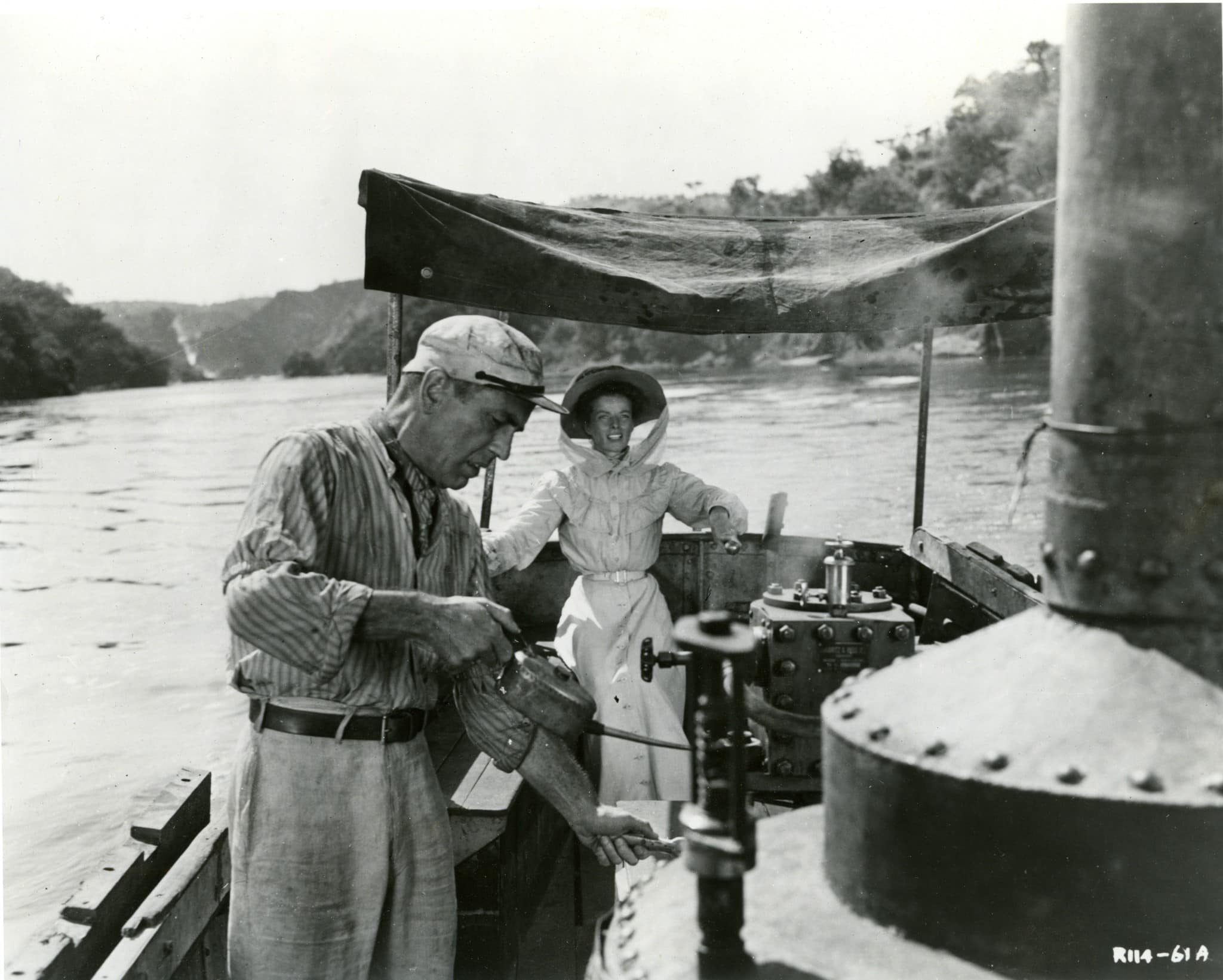 The boat used as The African Queen was built in England in 1912 and used by the British East Africa Company from 1912-68 to shuttle passengers and cargo across Lake Albert (on the border between Uganda and Belgian Congo). The African Queen sank and had to be raised twice during filming of the movie. Bacall is quoted as saying, “The natives had been told to watch it and they did. They watched it sink.”