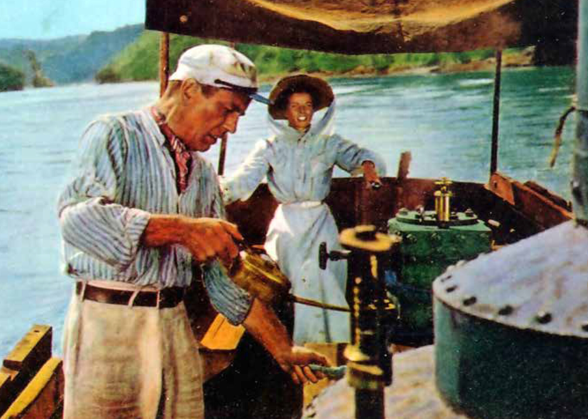 The African Queen (1951) offers a fascinating story both on-screen and, in terms of its production, an intriguing off-screen journey. The film is an adaptation of a novel by the same name published in 1935 by C.S. Forester. The film iteration of this tale was directed by John Huston with a screenplay by Huston, James Agee, Pieter Viertel, and John Collier. It was produced by Sam Spiegel and John Woolf, starring Humphrey Bogart, Katharine Hepburn, and Robert Morley, with cinematography by Jack Cardiff.