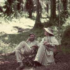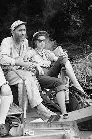 Bogart hated Africa immediately and was miserable, but Hepburn adored it, calling it “utterly divine.” Bogie complained about everything: the heat, the humidity, the dangers, the food. He recalled, “While I was griping, Katie was in her glory. She couldn’t pass a fern or berry without wanting to know its pedigree, and insisted on getting the Latin name for everything she saw walking, swimming, flying or crawling. I wanted to cut our ten-week schedule, but the way she was wallowing in the stinking hole, we’d be there for years.”