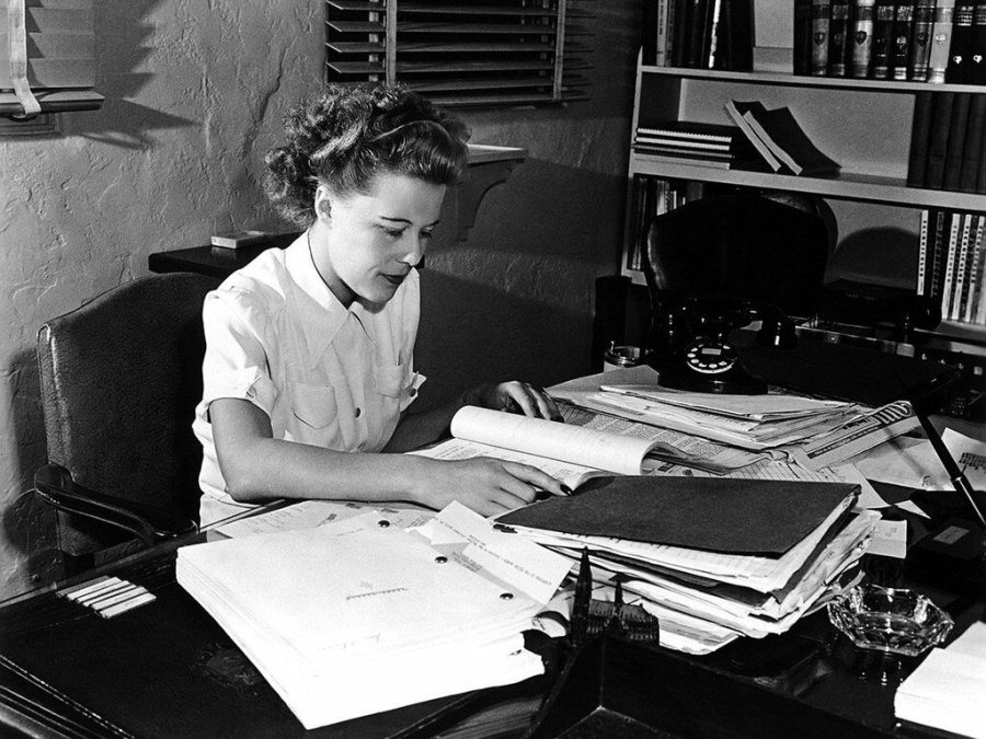 Joan Harrison works at her desk during the production of “Phantom Lady,” her first film as an producer, in 1944.