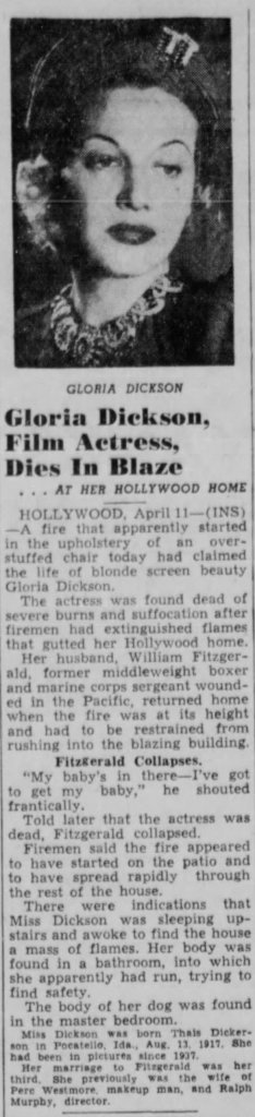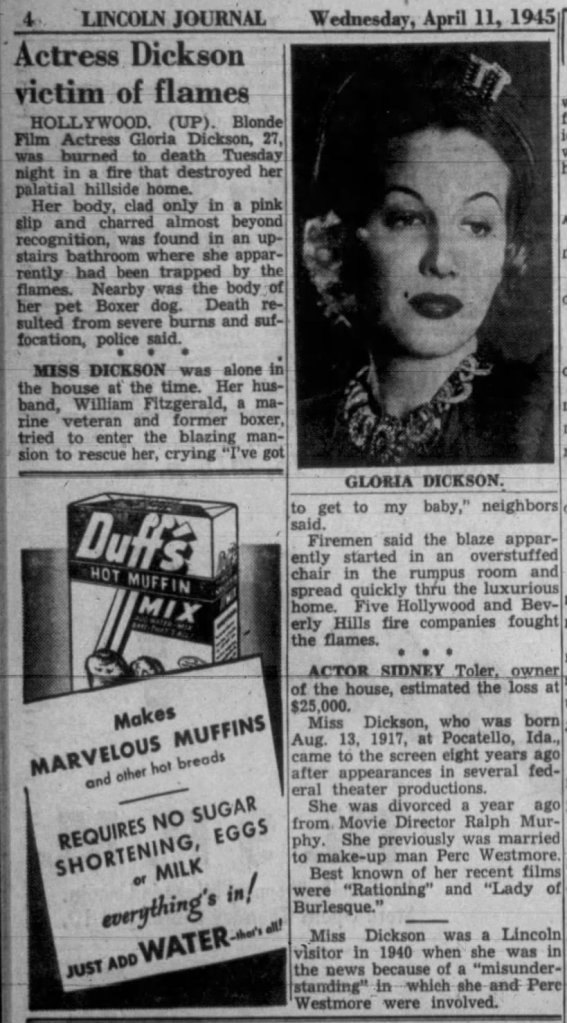 Dickson tragically died in a fire on April 10, 1945. She was residing in a Los Angeles, California, home that she was renting from actor Sidney Toler. The fire was caused by an unextinguished cigarette that she left behind. It ignited a chair on the ground floor while she was napping upstairs. Sadly, she and her pet boxer were found in the bathroom, as it was assumed that she tried to escape via the bathroom window. She ultimately passed from asphyxiation and had suffered first- and second-degree burns. She was 27 years old.
