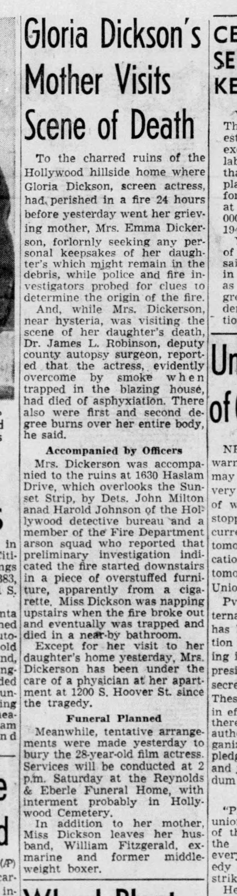 Dickson tragically died in a fire on April 10, 1945. She was residing in a Los Angeles, California, home that she was renting from actor Sidney Toler. The fire was caused by an unextinguished cigarette that she left behind. It ignited a chair on the ground floor while she was napping upstairs. Sadly, she and her pet boxer were found in the bathroom, as it was assumed that she tried to escape via the bathroom window. She ultimately passed from asphyxiation and had suffered first- and second-degree burns. She was 27 years old.