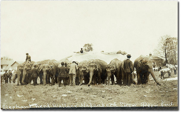 1908 postcard view of elephants from the Wallace-Hagenbeck Shows at Peru, Indiana. They appear to be erecting or taking down a circus tent. There are horses in the view as well.
