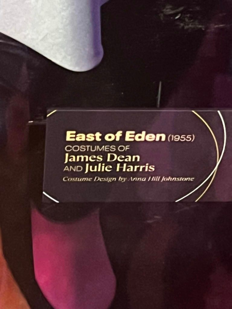 Update, 2023: The 2023 Turner Classic Movies Film Festival displayed two costumes worn by Julie Harris and James Dean from East of Eden. (My path seems to have crossed with the East of Eden suit after 11 years!) These were displayed at Club TCM in the Hollywood Roosevelt Hotel. The theme of the festival honored the Warner Bros. centennial.