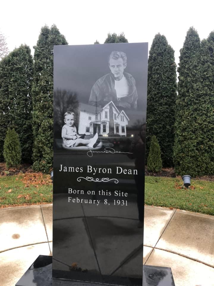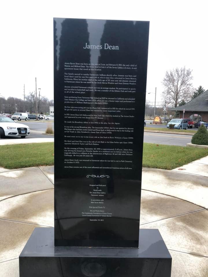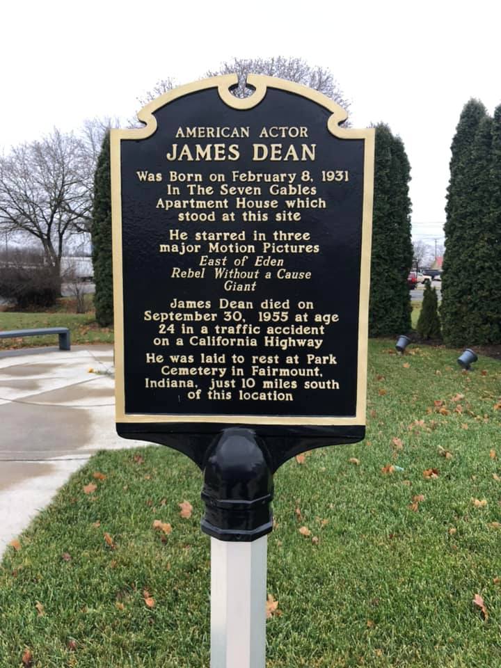 Today, Dean is remembered with tributes in numerous locations. The memorial at the site of his birthplace is marked with a plaque on the southwest corner of E. 4th St. and McClure St., Marion, Indiana. A star-shaped plaque is located on the sidewalk at the far corner of the lot. The memorial plaque, dedicated in 2015, stands in a small park area, accompanied by a marker.