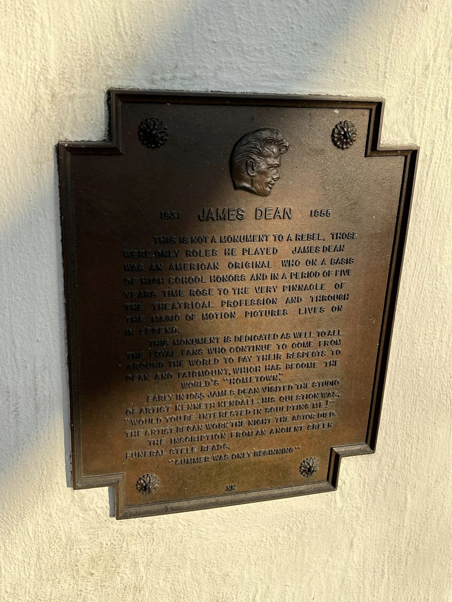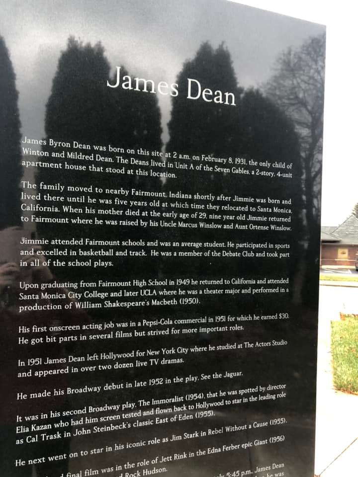 My sister & I made a road trip to Fairmount about 25 years ago, so your fine article brought back a lot of memories! We left from near Muskegon MI, spent the night in Kokomo IN & drove to Fairmount the next morning (it was in late spring, so I am not sure if they had already begun celebrating James Dean Days yet, or we surely would have gone in September instead). There were very few tourists the day we visited. I was really impressed with the James Dean Gallery & remember a small room where you could watch short videos, including the safe driving PSA he filmed with Gig Young. I recall walking by the old Fairmount High School — I wonder if it was ever replaced? We had lunch at a small diner/cafe in town that I only recall had underwhelming food & a very dark, dingy ladies’ room! Hopefully, there have been some changes for the better in town during the last couple decades!
