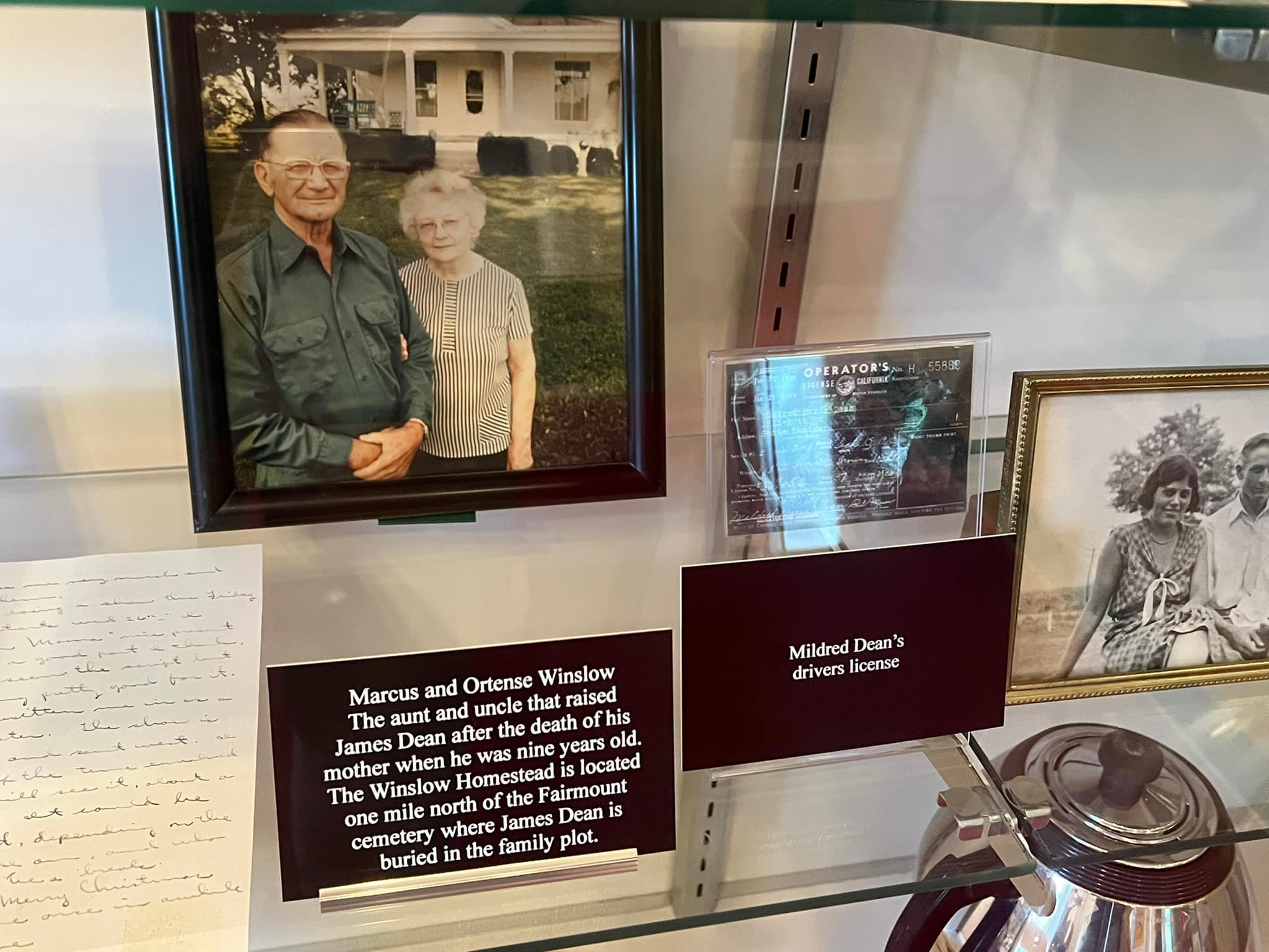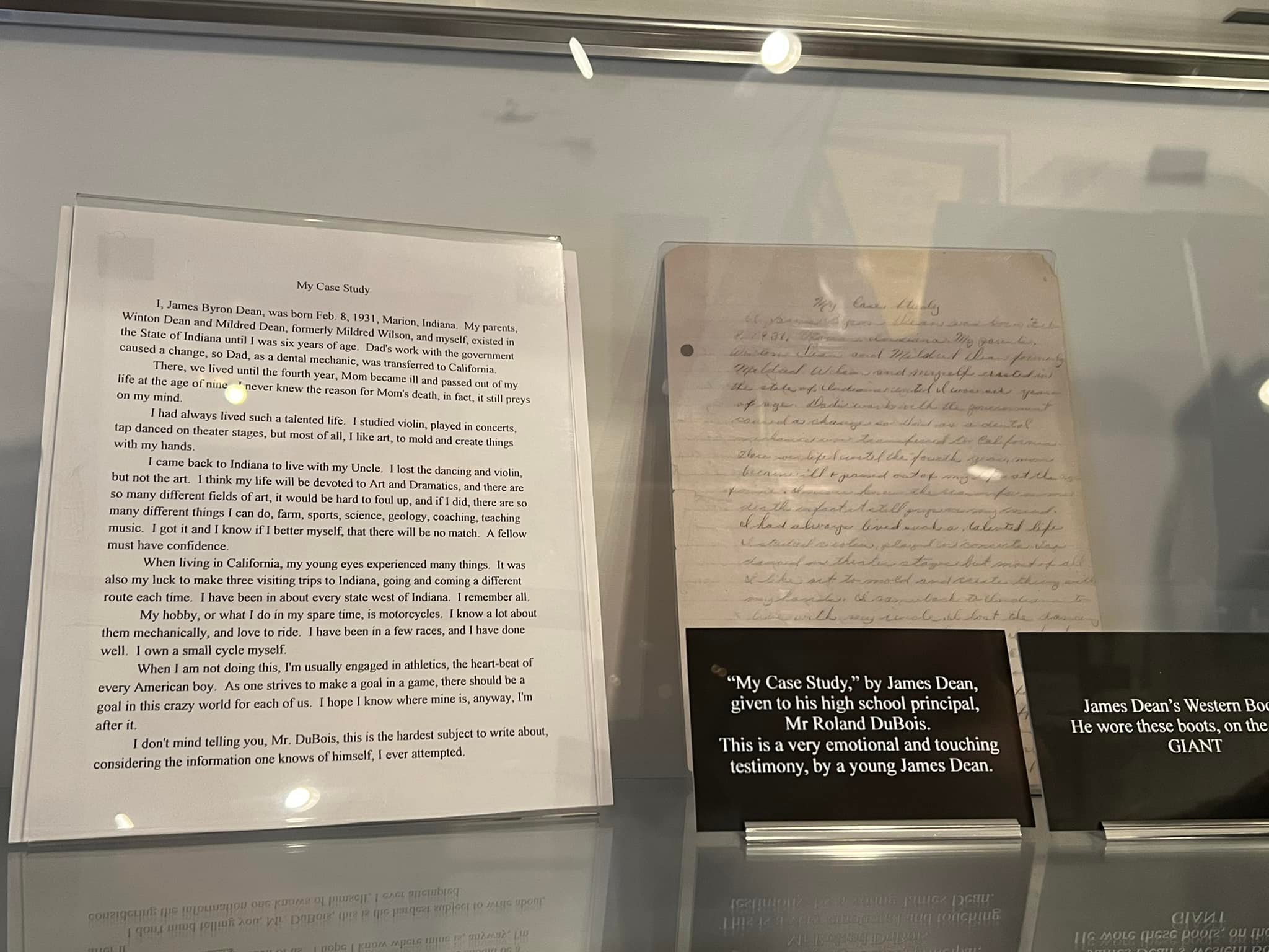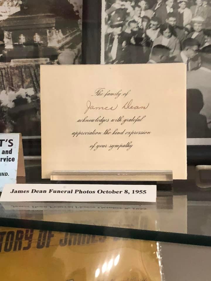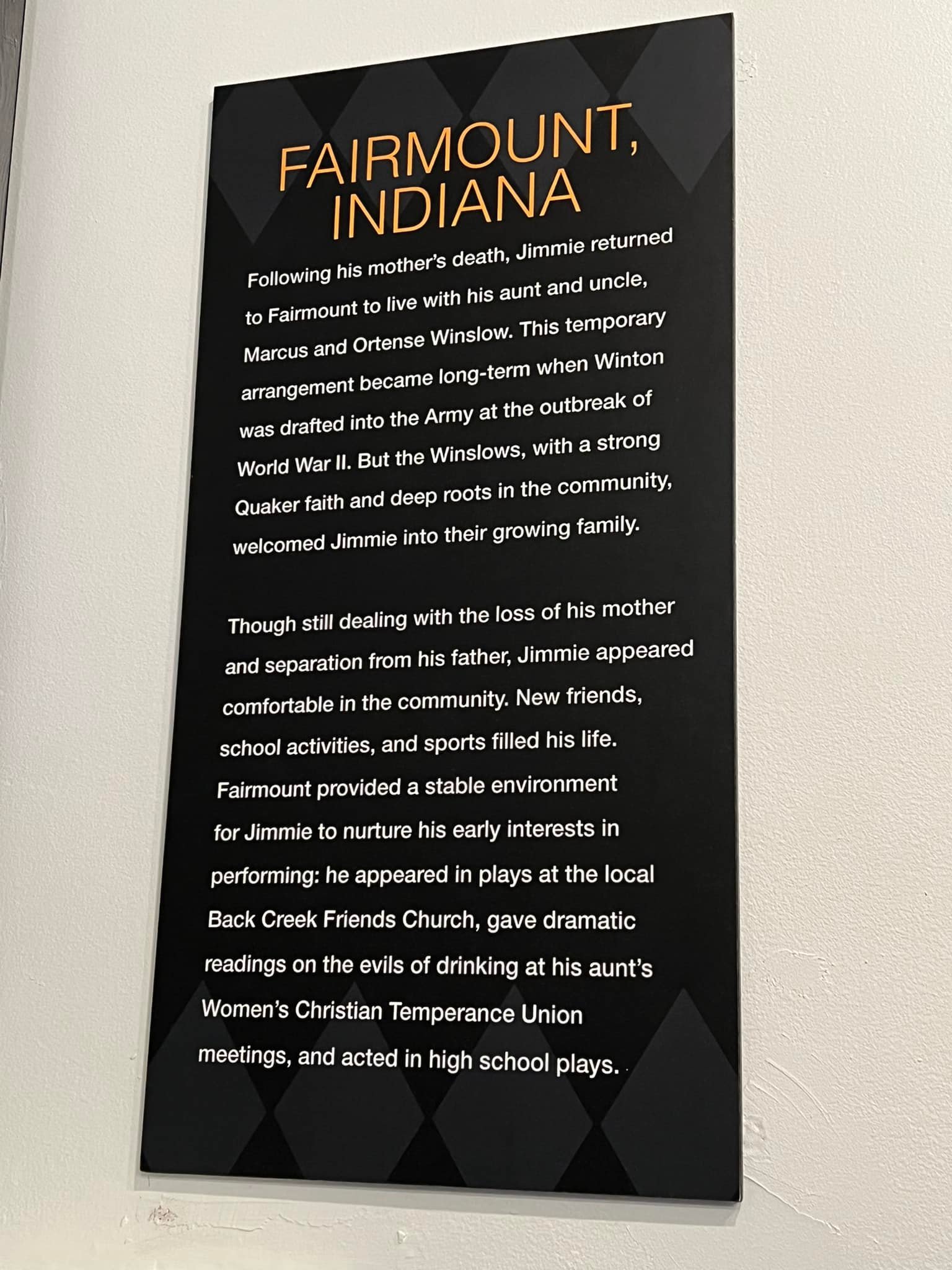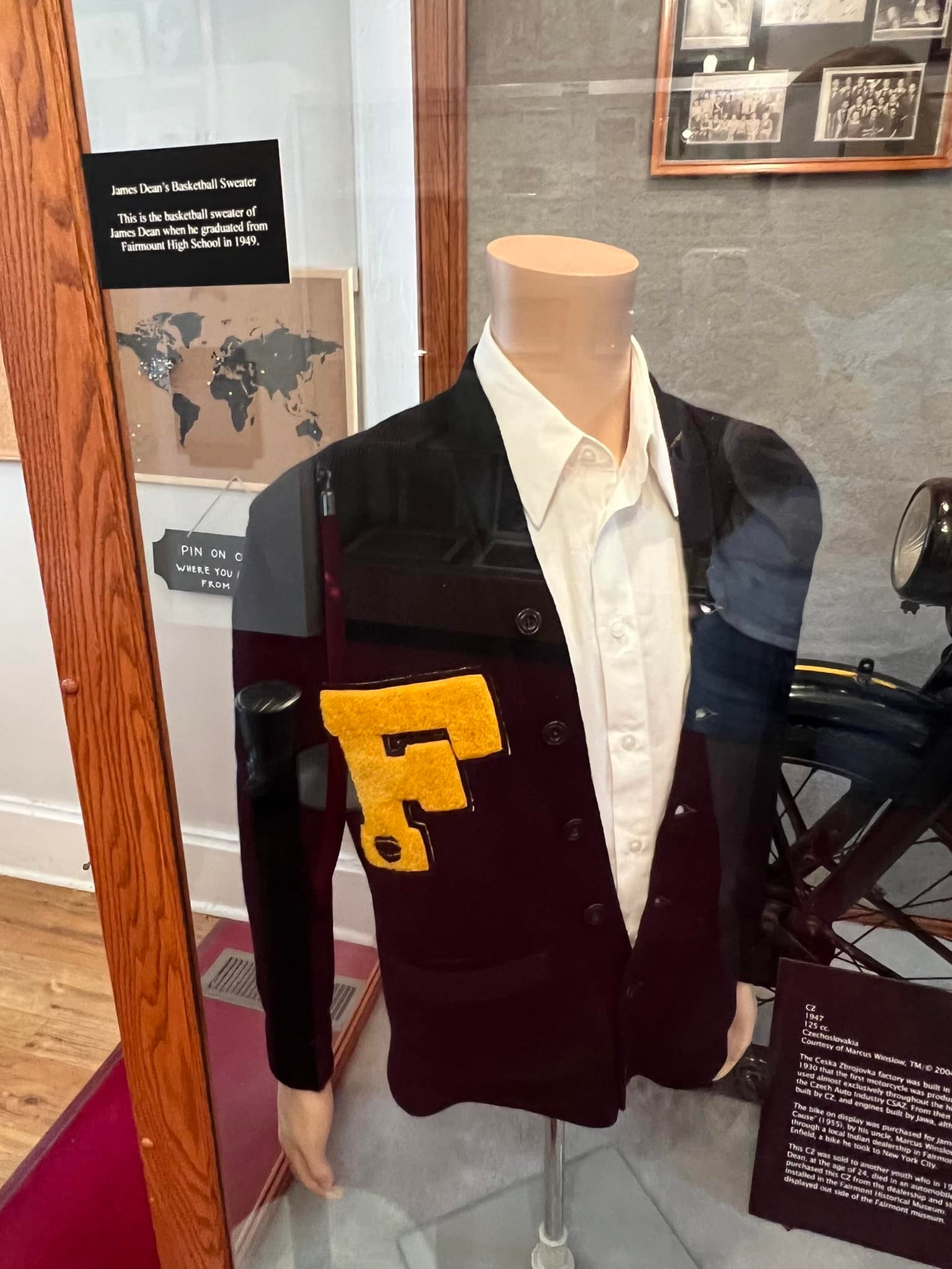 Update, 2012: Years after my first trip to Fairmount, the Indiana State Museum honored Dean with an exhibit. Here are some shots from that display. My favorite item is the East of Eden suit; however, you’ll also find the script from Giant, the car in which Dean drove his prom date, his middle school basketball uniform, and more.