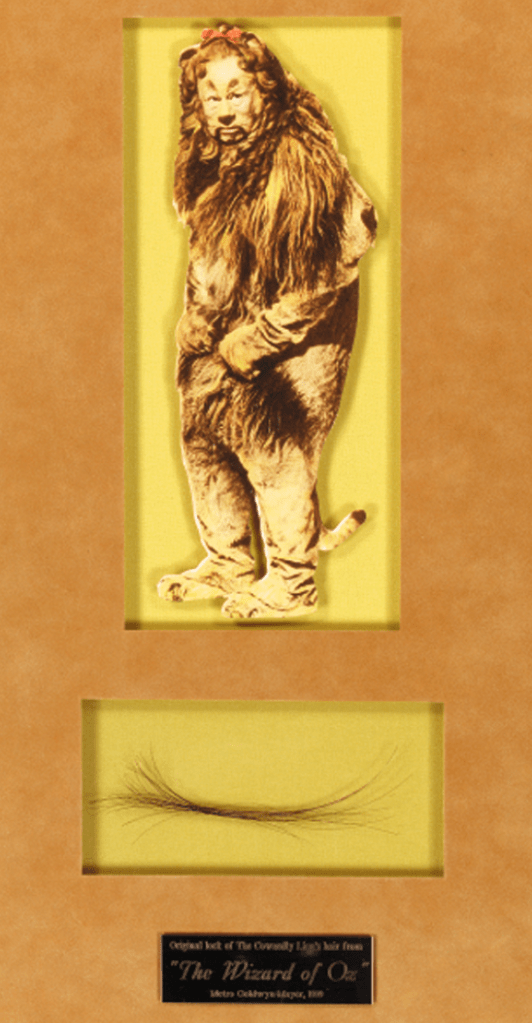 “A lock of The Cowardly Lion’s hair shed during the conservation of the costume. Tan, brown, and black African lion’s hair is presented in silk, suede & bamboo in common with a photo of actor Bert Lahr in his trademark pose and an engraved plaque that reads, “Original lock of The Cowardly Lion’s hair from “The Wizard of Oz”, Metro Goldwyn-Mayer, 1939.”