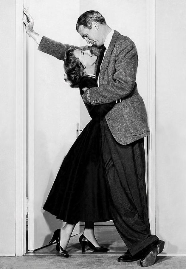 Film, ґDie Glenn Miller Storyґ, USA 1954, Regie: Anthony Mann, Szene mit: James Stewart & June Allyson Umarmung Paar im Tьrrahmen sakko