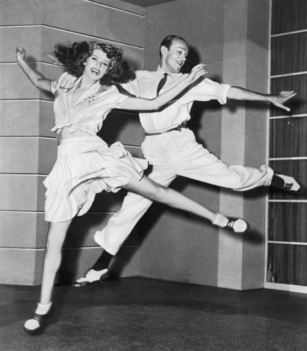 From left: co-stars Rita Hayworth and Fred Astaire relax between takes of YOU'LL NEVER GET RICH, 194