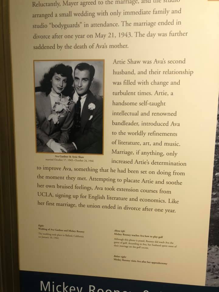 Gardner’s second marriage was to bandleader Artie Shaw in 1945, divorcing in 1946. She would also be pursued by aviator Howard Hughes.