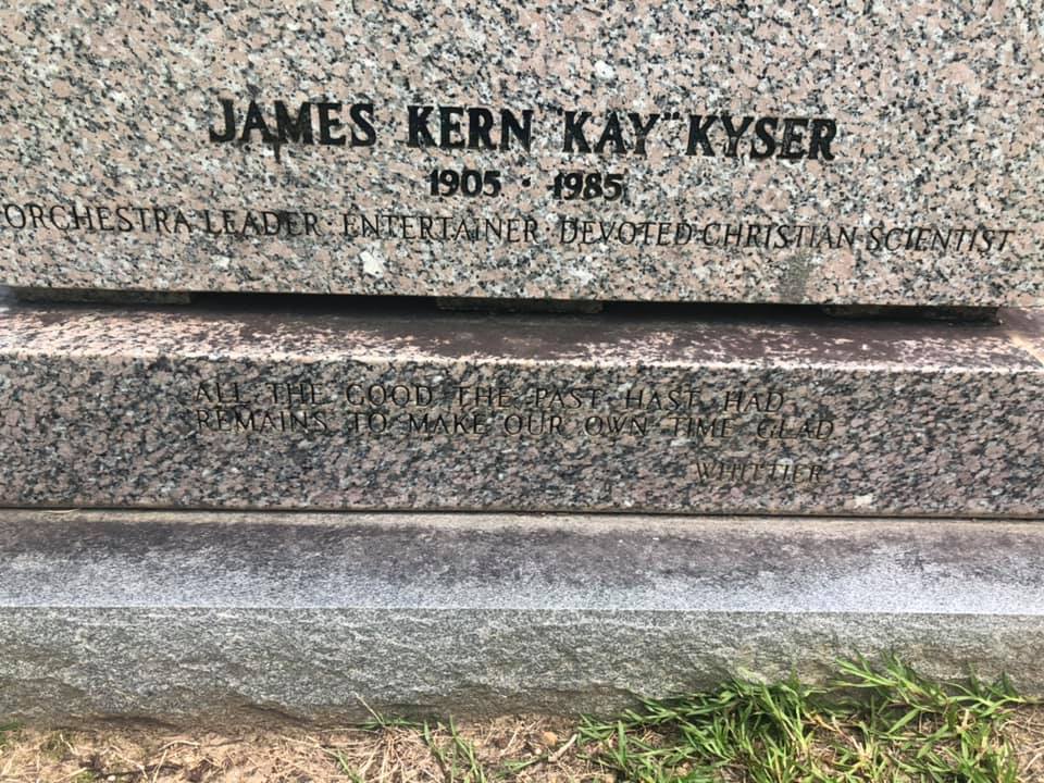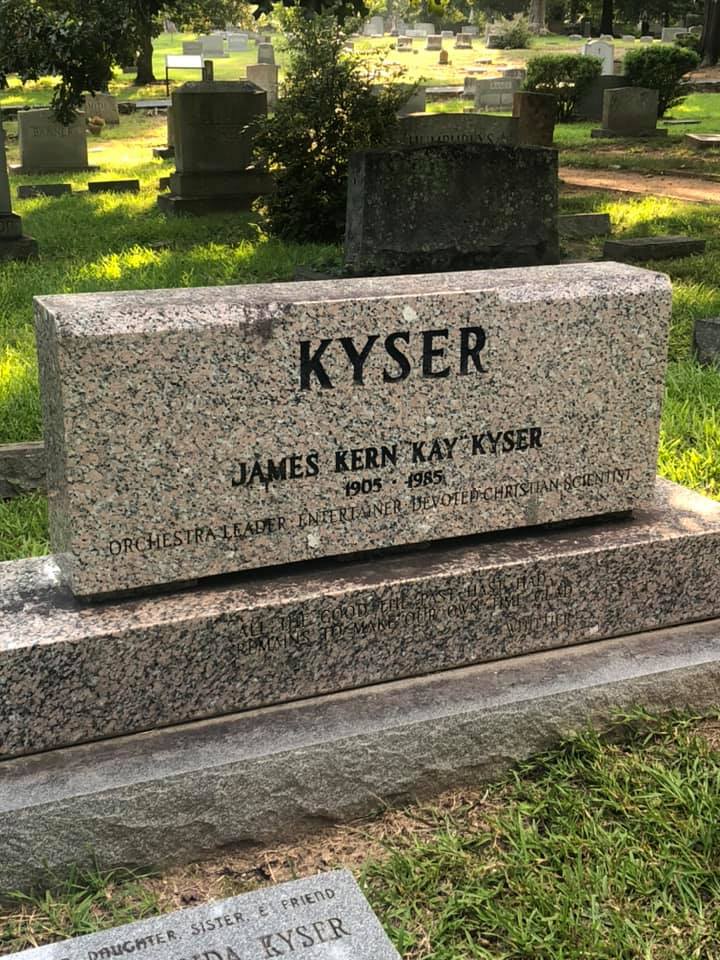 The Kyser family home was located at 219 Sunset Ave., Rocky Mount, North Carolina. Kyser’s parents and the six children resided in the home for decades. The home longer stands, however, a historic marker in Kyser’s honor was dedicated there in 2019. Kyser’s two remaining daughters–Kimberly and Amanda–attended the ceremony, as did Kyser’s best friend from childhood. The mayor declared October 5th as Kay Kyser Day in Rocky Mount, presenting plaques to Kyser’s daughters. The day culminated with an evening performance filled with Kyser’s music. The marker is behind the First Methodist Church, on the corner of Franklin St. and Sunset Ave. in Rocky Mount.