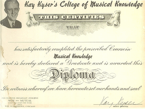 Kyser and his orchestra recorded sessions for Victor at Camden, New Jersey, and Chicago, Illinois, in the 1920s. Upon his graduation, Kyser and his band toured restaurants and nightclubs throughout the Midwest, gradually building a following. Kyser was especially popular at the Blackhawk Restaurant in Chicago, where Kyser came up with a musical quiz act called “Kay Kyser’s Kollege of Musical Knowledge,” broadcast on the Mutual Broadcasting System and, later, NBC Radio.