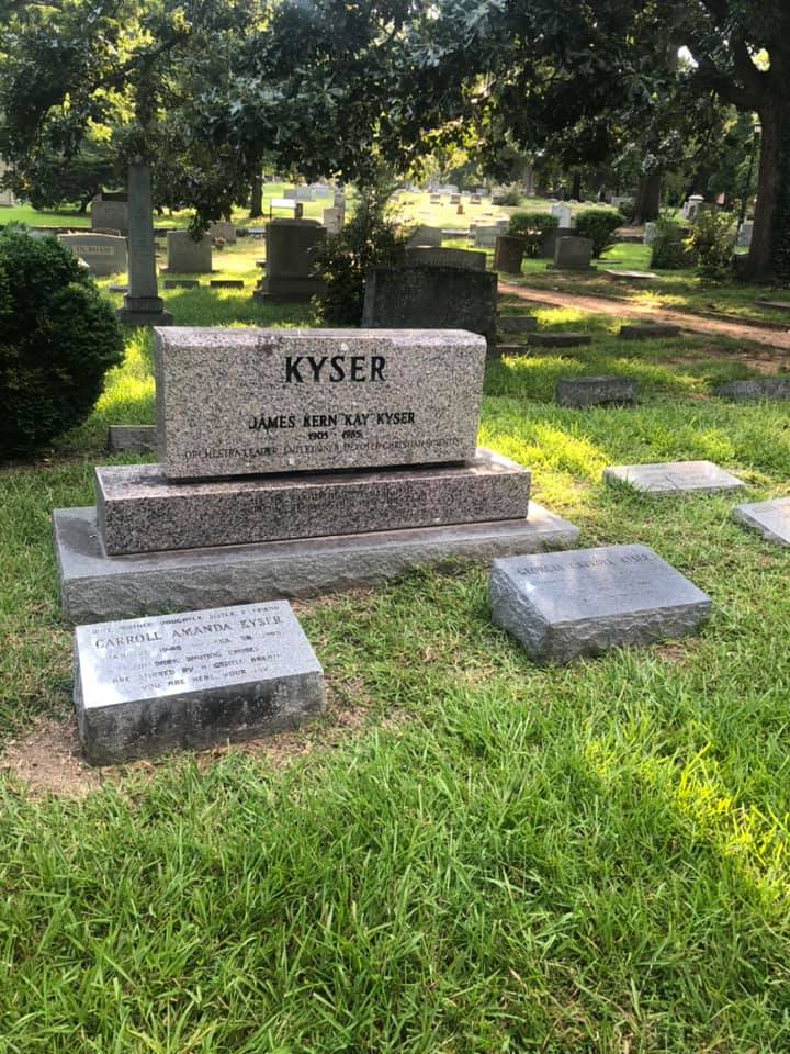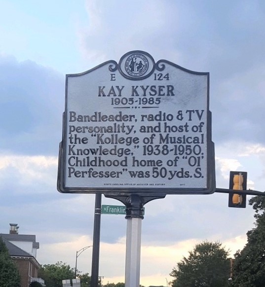 The Kyser family home was located at 219 Sunset Ave., Rocky Mount, North Carolina. Kyser’s parents and the six children resided in the home for decades. The home longer stands, however, a historic marker in Kyser’s honor was dedicated there in 2019. Kyser’s two remaining daughters–Kimberly and Amanda–attended the ceremony, as did Kyser’s best friend from childhood. The mayor declared October 5th as Kay Kyser Day in Rocky Mount, presenting plaques to Kyser’s daughters. The day culminated with an evening performance filled with Kyser’s music. The marker is behind the First Methodist Church, on the corner of Franklin St. and Sunset Ave. in Rocky Mount.