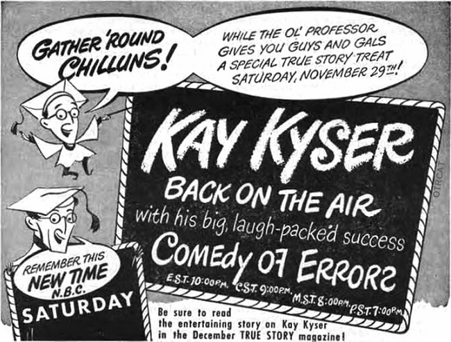 Kay Kyser’s Kollege of Musical Knowledge made its way to television on NBC-TV. Struggling with arthritis, Kyser retired from performing in 1950. He converted to Christian Science and ran the film and television department of the church in Boston, Massachusetts, eventually becoming its president in 1983.