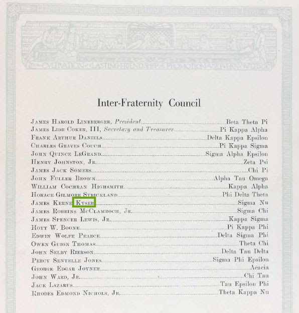 In the years to come, Kyser attended and graduated with his Bachelor’s degree from the University of North Carolina at Chapel Hill. There, he was active in the Sigma Nu Fraternity and senior class president.