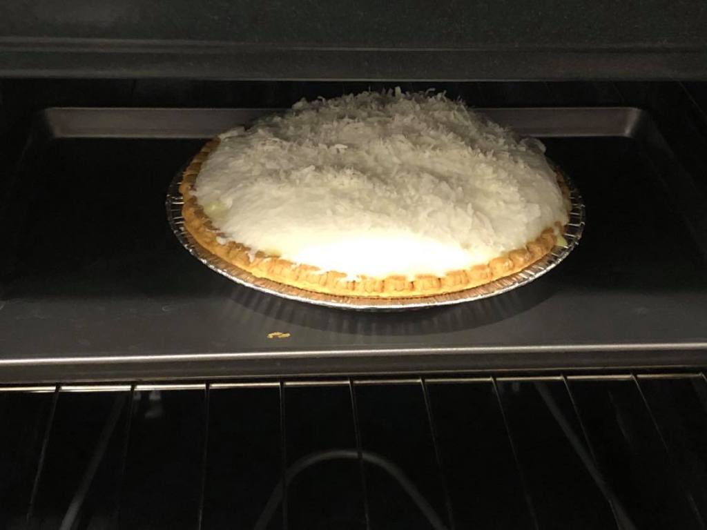 After the pie was filled and topped with meringue, I dusted on some coconut flakes and popped it into the oven for about 5 minutes to toast the coconut and cook the meringue. The final result led the pie to take a more golden-brown hue.