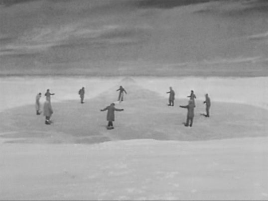 The famous scene during which the crew forms a ring around the flying saucer frozen in the ice to get a sense of its scale was filmed at the RKO Ranch in the San Fernando Valley in one hundred degree weather.