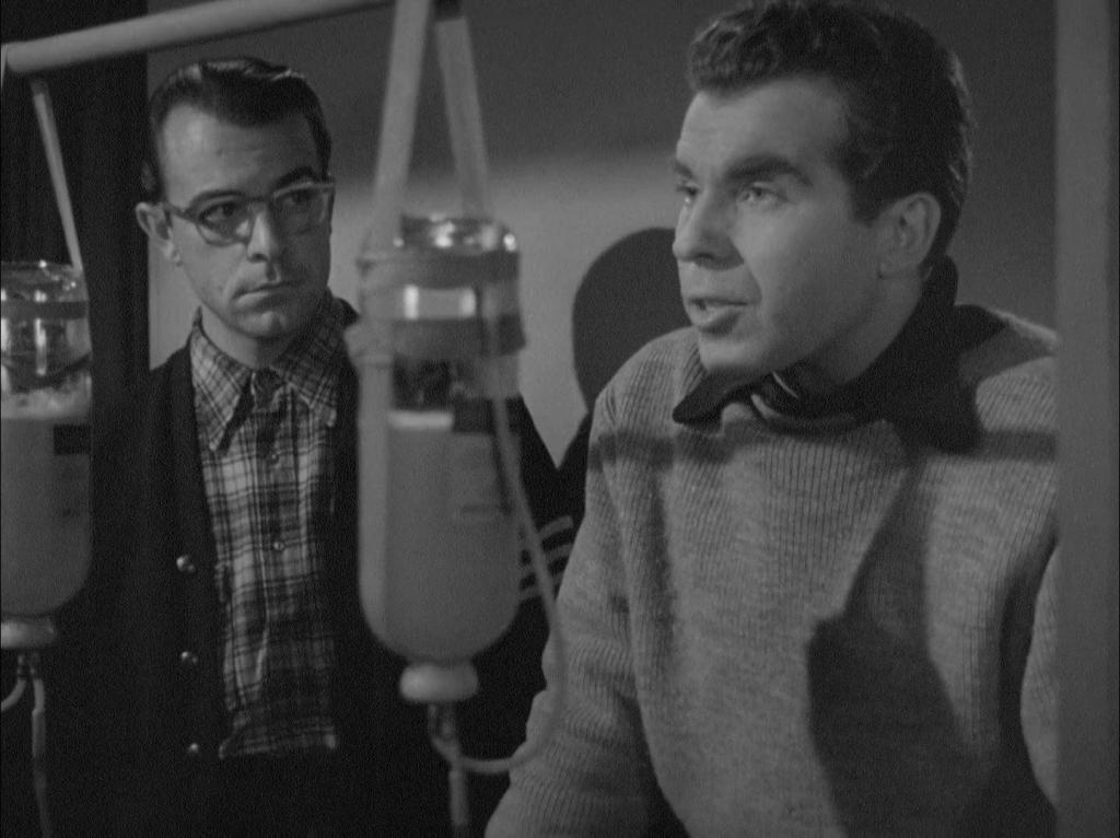 Much of the dialogue overlaps when characters interrupt each other. This attempt at “realistic” fast-patter conversation is reminiscent of His Girl Friday (1940), directed by Howard Hawks. Interestingly, George Fenneman appears in a small role in this film and was concurrently gaining fame as Groucho Marx’s announcer on You Bet Your Life. He reportedly struggled with the overlapping dialogue required in this film.