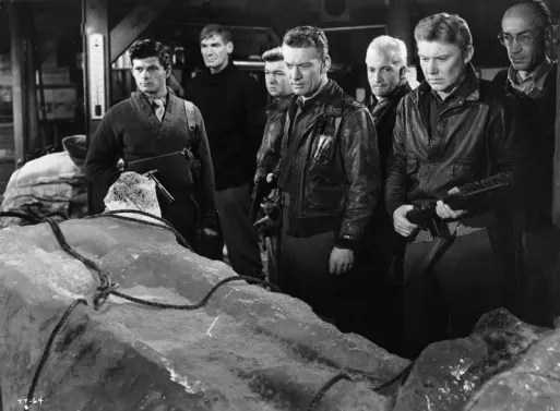 This film was based on a 1938 novella, entitled “Who Goes There?” by John W. Campbell, though published under the pseudonym of Don A. Stuart. Writers Charles Lederer and Ben Hecht convinced Hawks to purchase the rights to the story, and succeeded, paying $1,250. Changes were made to the story, with one notable change being the dismissal of the creature’s ability to take on the characteristics of any being as a defense and predatory mechanism; instead, to accommodate the smaller budget, the writers shifted the creature to a humanoid being that is akin to vegetation but also feeds on blood.