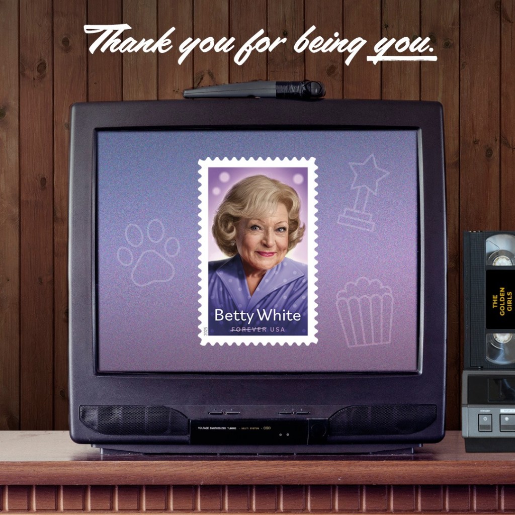 Art director Greg Breeding designed the stamp with original art by Dale Stephanos. White is featured smiling in a purple and white polka dot top and wearing paw print earrings–a direct tribute to her animal welfare activism.