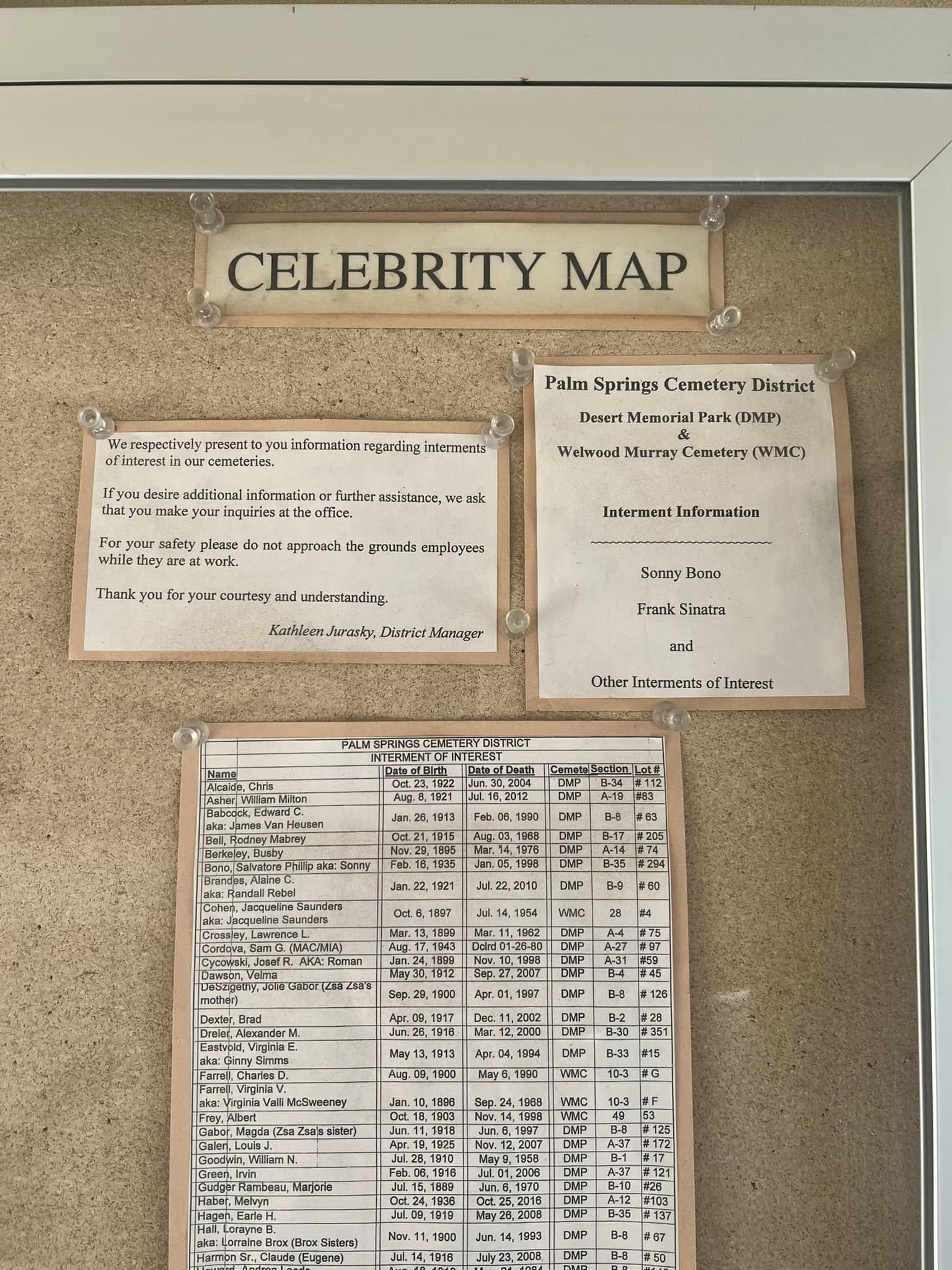 This cemetery has many notable individuals at rest here with strong ties to the entertainment industry and the Palm Springs area.