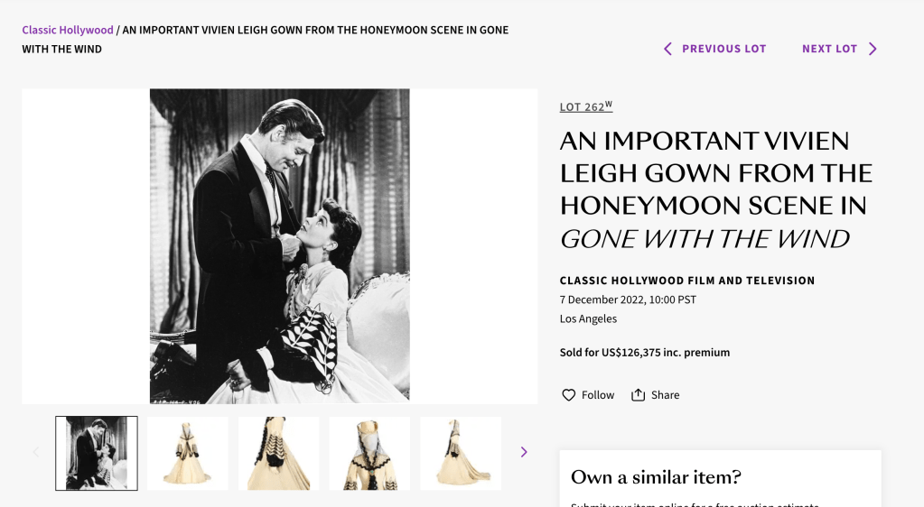 Update 2022: The Gone with the Wind Museum had the Bengaline gown on display until 2022. It went to auction on December 7, 2022, and sold for $126,375 USD.