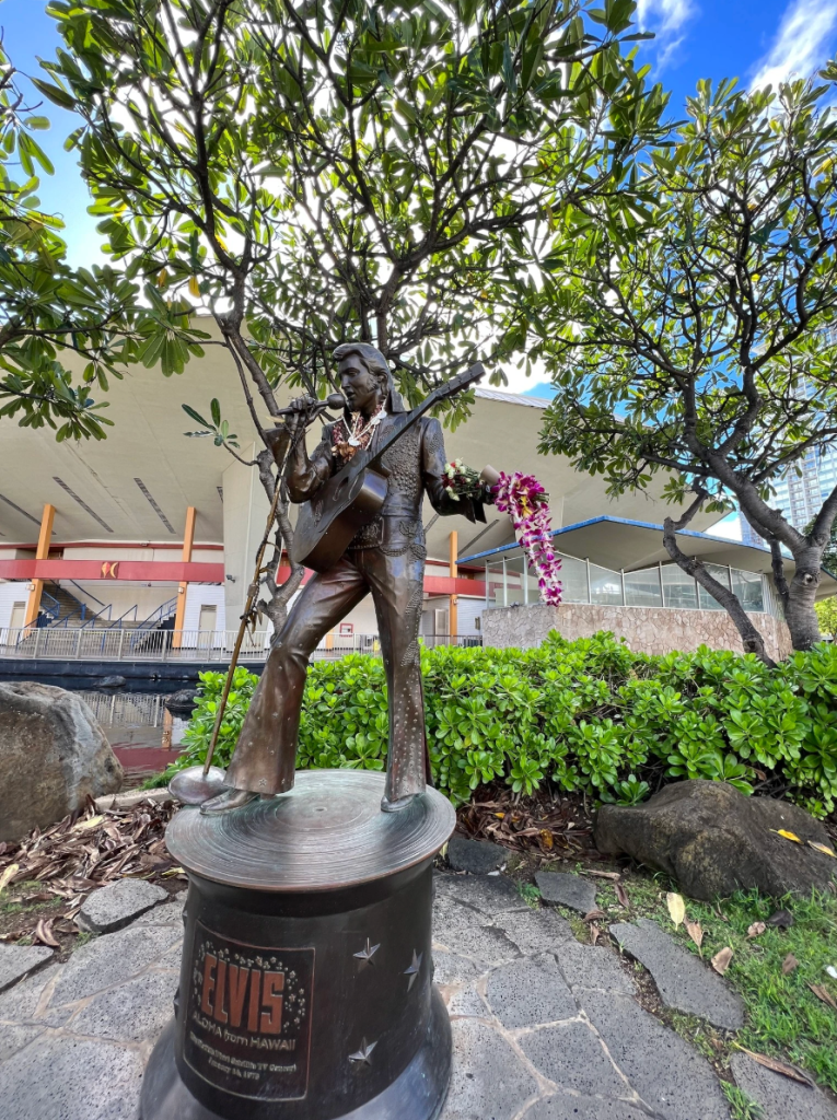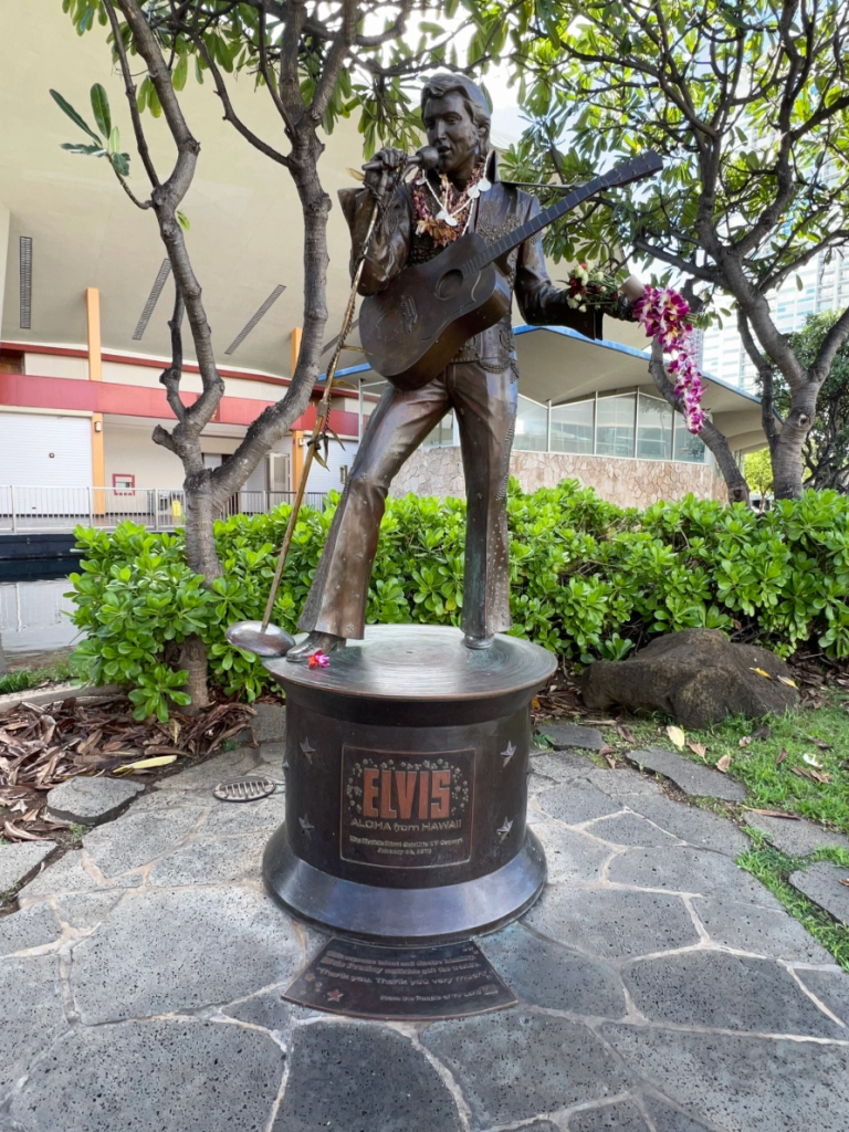 Elvis Presley was also celebrated with a TV Land statue, honoring the “World’s First Satellite TV Concert” performed at that location on January 14, 1973. The statue stands near the parking lot of the Neal Blaisdell Center.