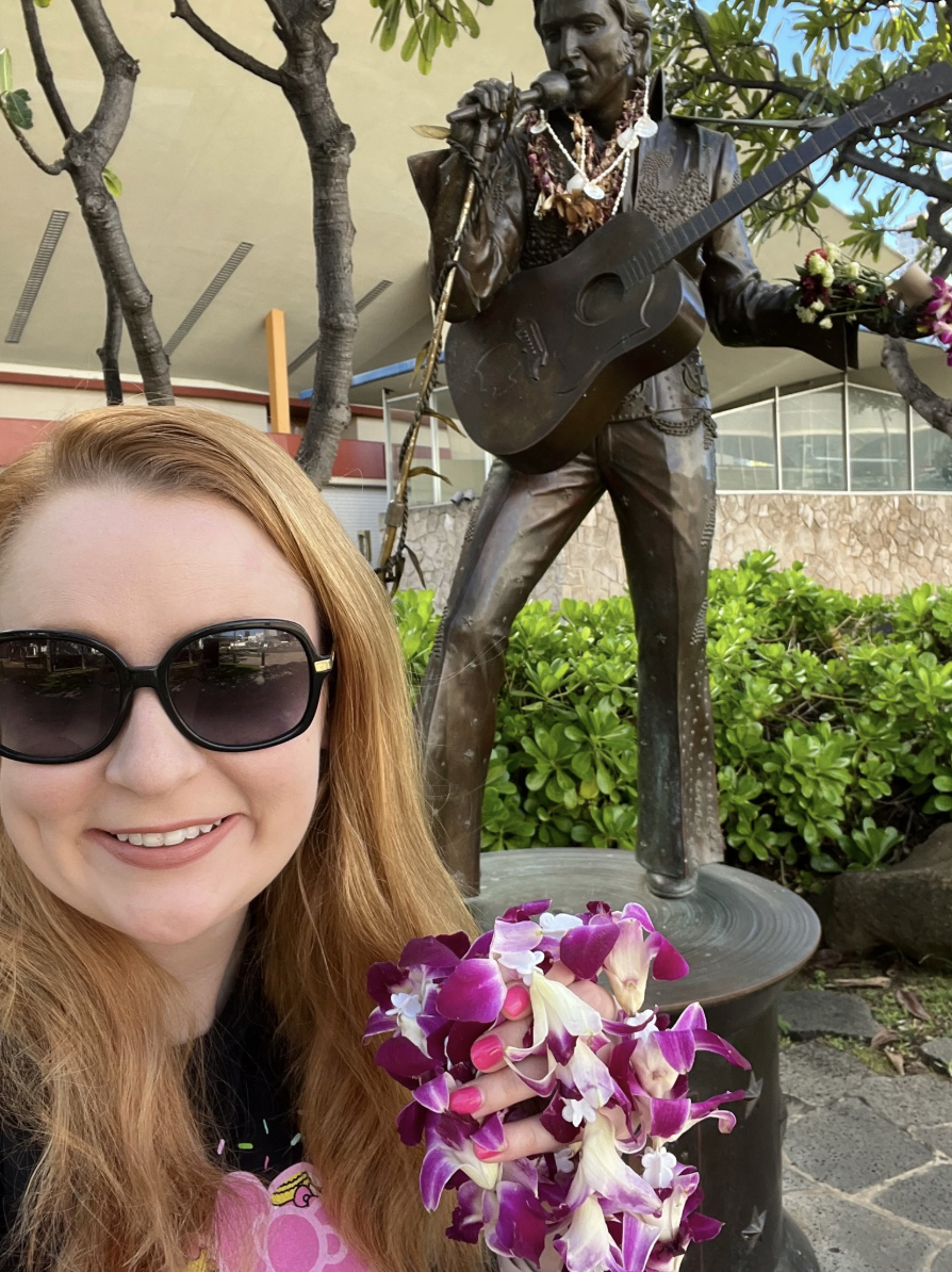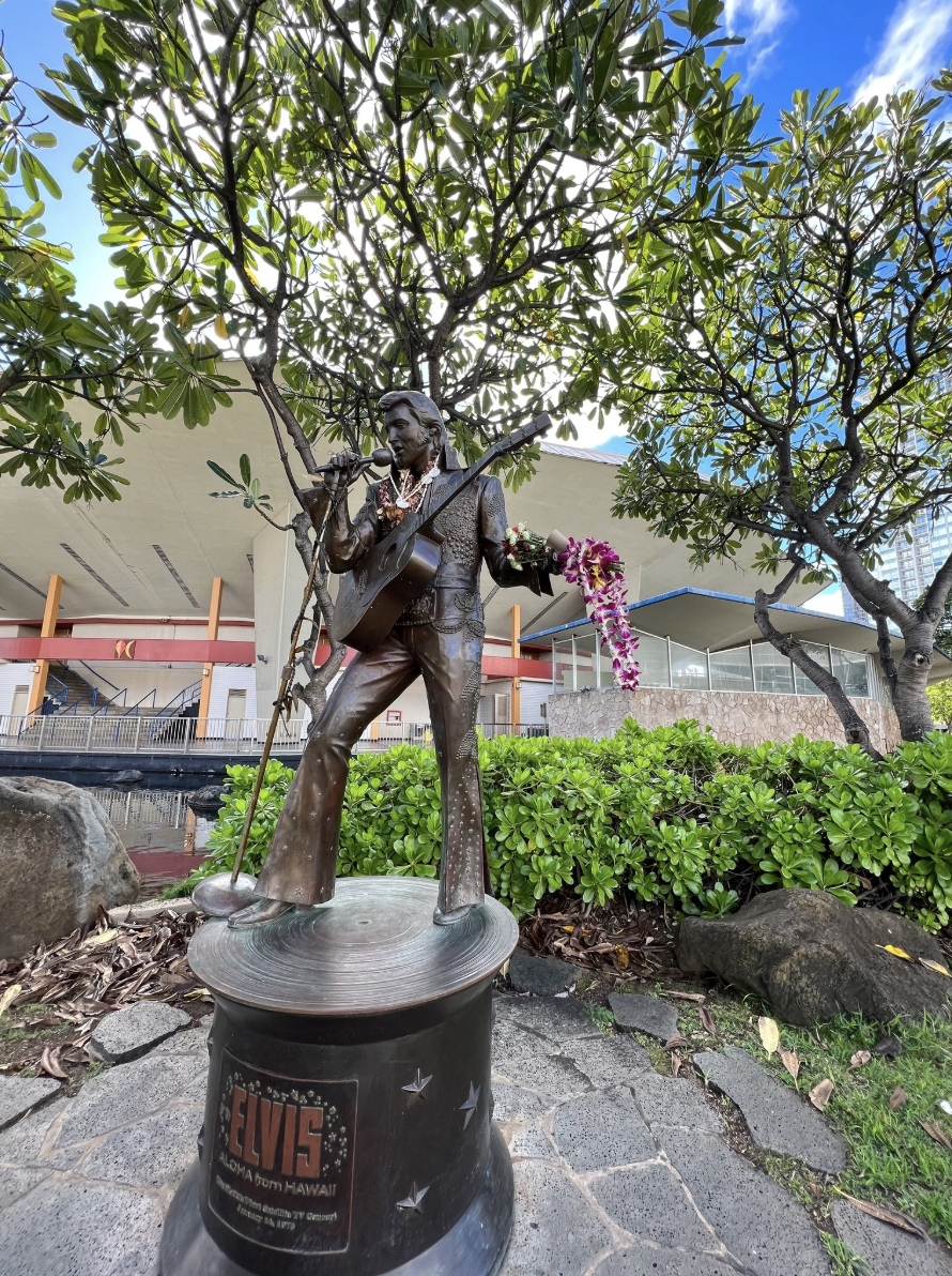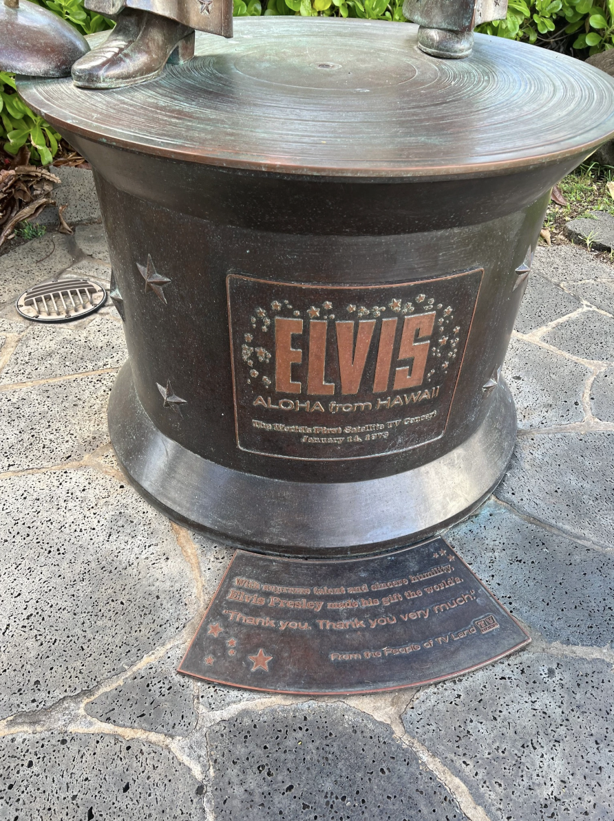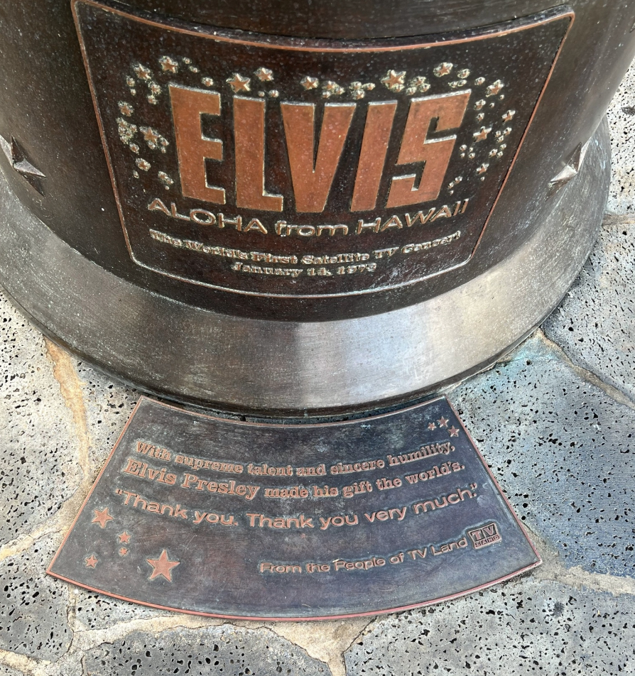 Elvis Presley was also celebrated with a TV Land statue, honoring the “World’s First Satellite TV Concert” performed at that location on January 14, 1973. The statue stands near the parking lot of the Neal Blaisdell Center.