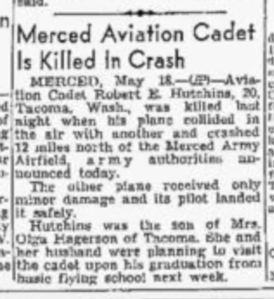 Tragically, Hutchins was killed as a result of a mid-air collision on May 17, 1945. He was trying to land a plane during the last 30 minutes of his basic training when it struck another plane of the same unit at Merced Army Air Field in Merced, California, which later became Castle Air Force Base. Edward F. Hamel, the other pilot, survived. Hutchins was close to graduating from this training program and his mother was scheduled to travel to the airfield the following week for the commencement ceremony. He was 20 years old.