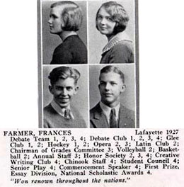 Farmer grew up in West Seattle, at 2636 47th St SW. She was the child of an attorney father and a particularly domineering social activist mother. Her parents would later divorce. While attending West Seattle High School, Farmer entered and won $100 from a writing contest sponsored by Scholastic Magazine, with her controversial essay, “God Dies.” Her piece stirred outrage from the religious members of her town, with headlines in Seattle and beyond, reading, “Seattle Girl Denies God and Wins Prize.” As hate mail piled into Farmer’s mailbox, Farmer began to dream of leaving West Seattle.